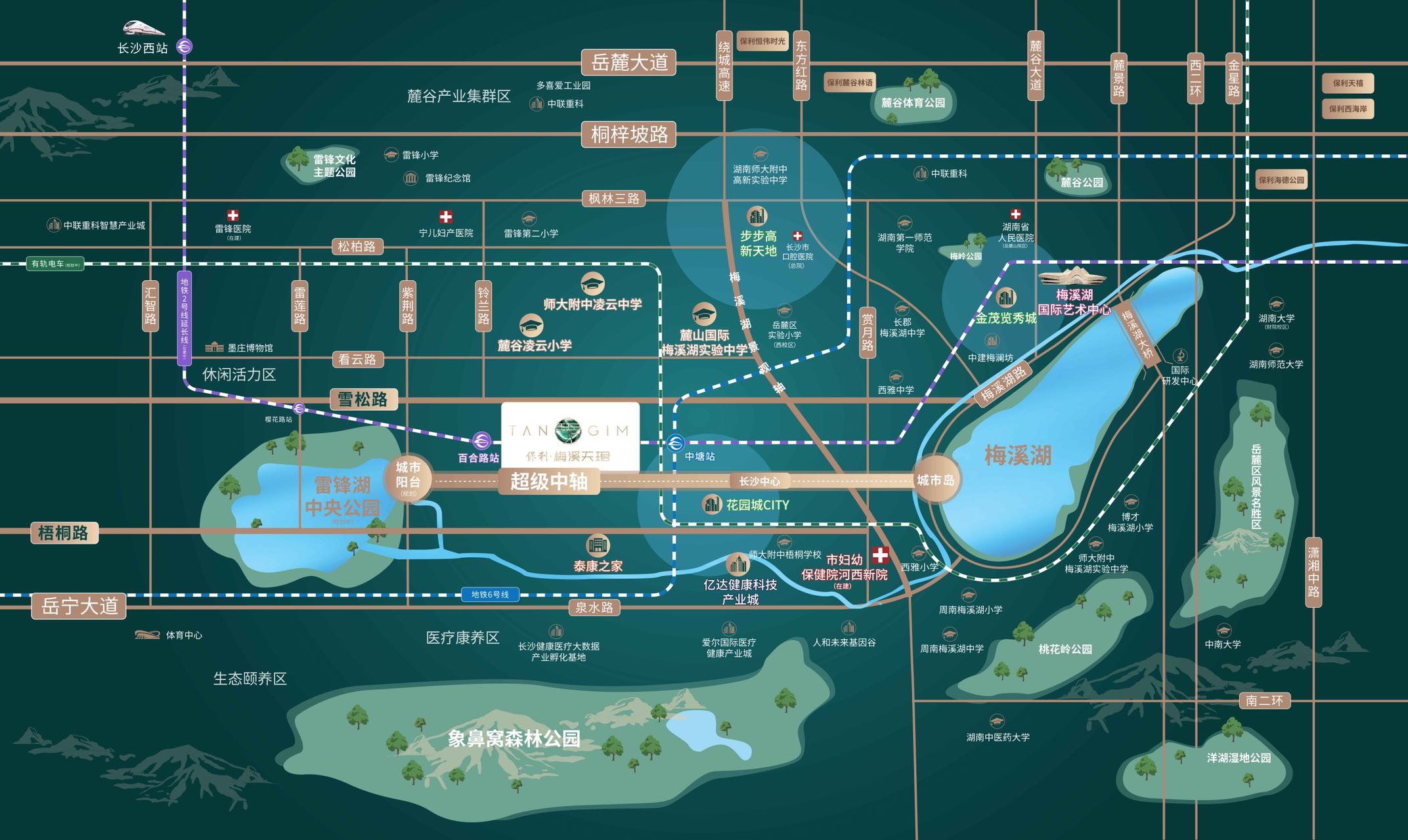 近百万方繁华商业东临梅溪湖招商花园城(在建,预计于2024年下半年开业),24小时一站式商业体,规划10万方体量。周边约3公里范围内,已开业金茂览秀城、中建梅澜坊、步步高梅溪新天地三大商业综合体,总商业体量近100万方。
